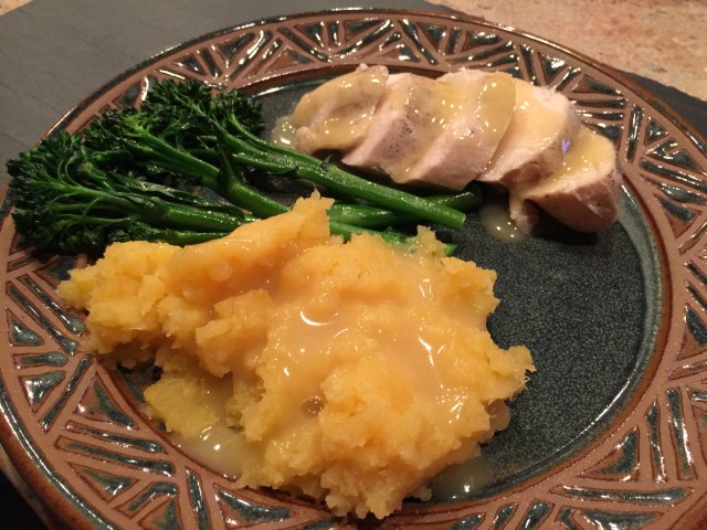 Sous vide half chicken breast, rutabagas, broccolini, and gravy