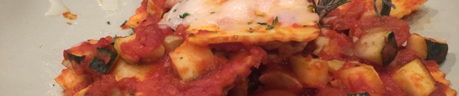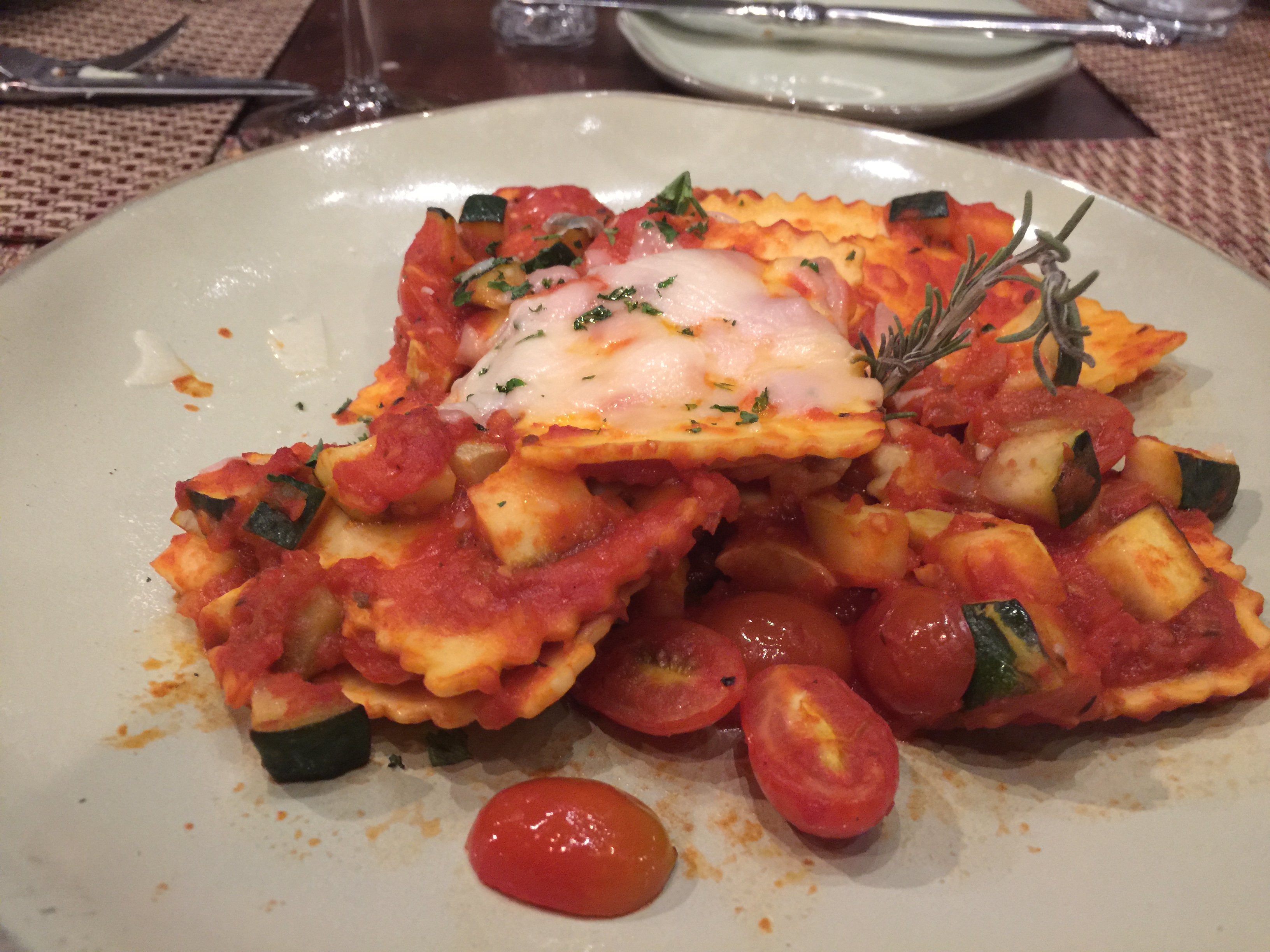 Overcooked cheese ravioli and tasteless pomodoro sauce served with undercooked zucchini cubes served at slightly less than room temperature