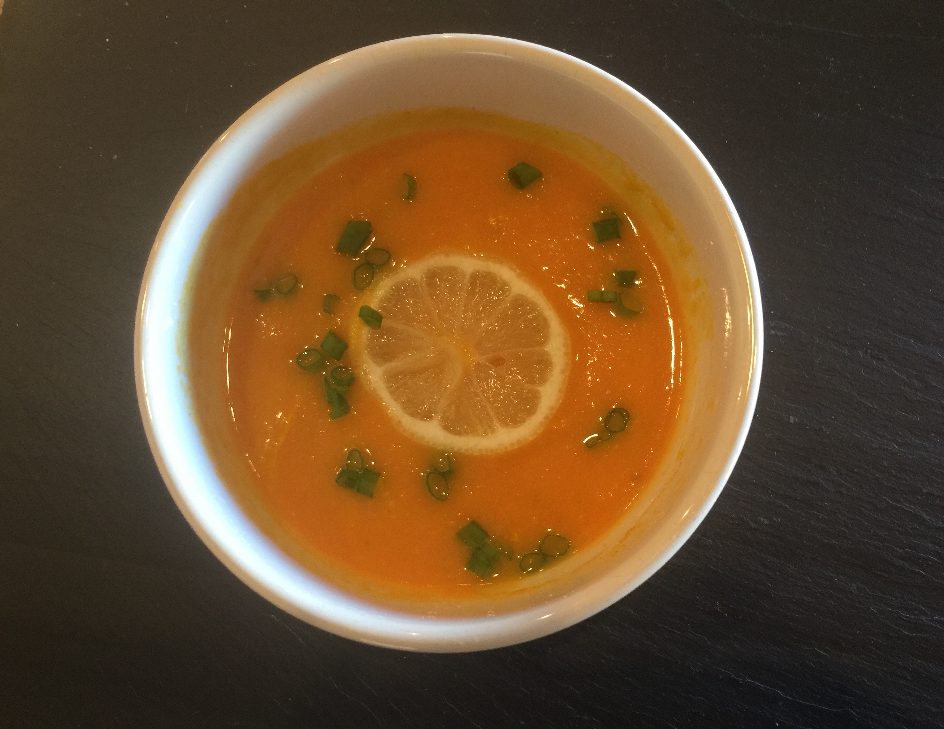 This was followed by Autumn Soup (again!). I guess I made a lot of this. Today I decorated it with a lemon slice and chopped scallions. This purée of mostly root vegetables surely does keep one regular!