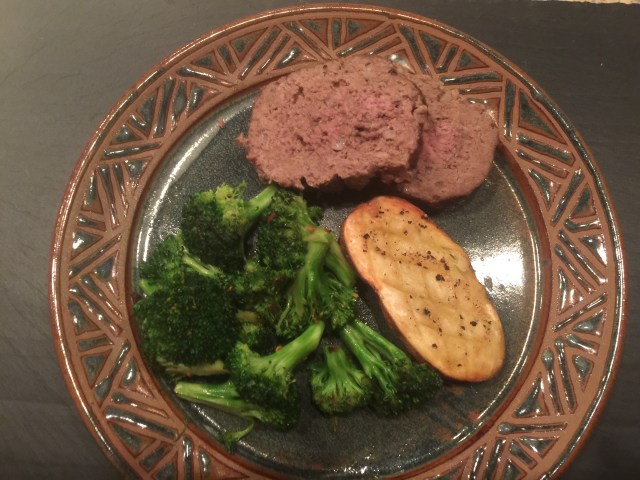 Tonight’s dinner was meatloaf. As John says I could make this in my sleep following my mom’s recipe. I love it and I love a meatloaf sandwich the next day. I know I need to find a yummy substitute. Maybe a loaf made of lentils? I served it with half a baked potato and a whole slew of broccoli.