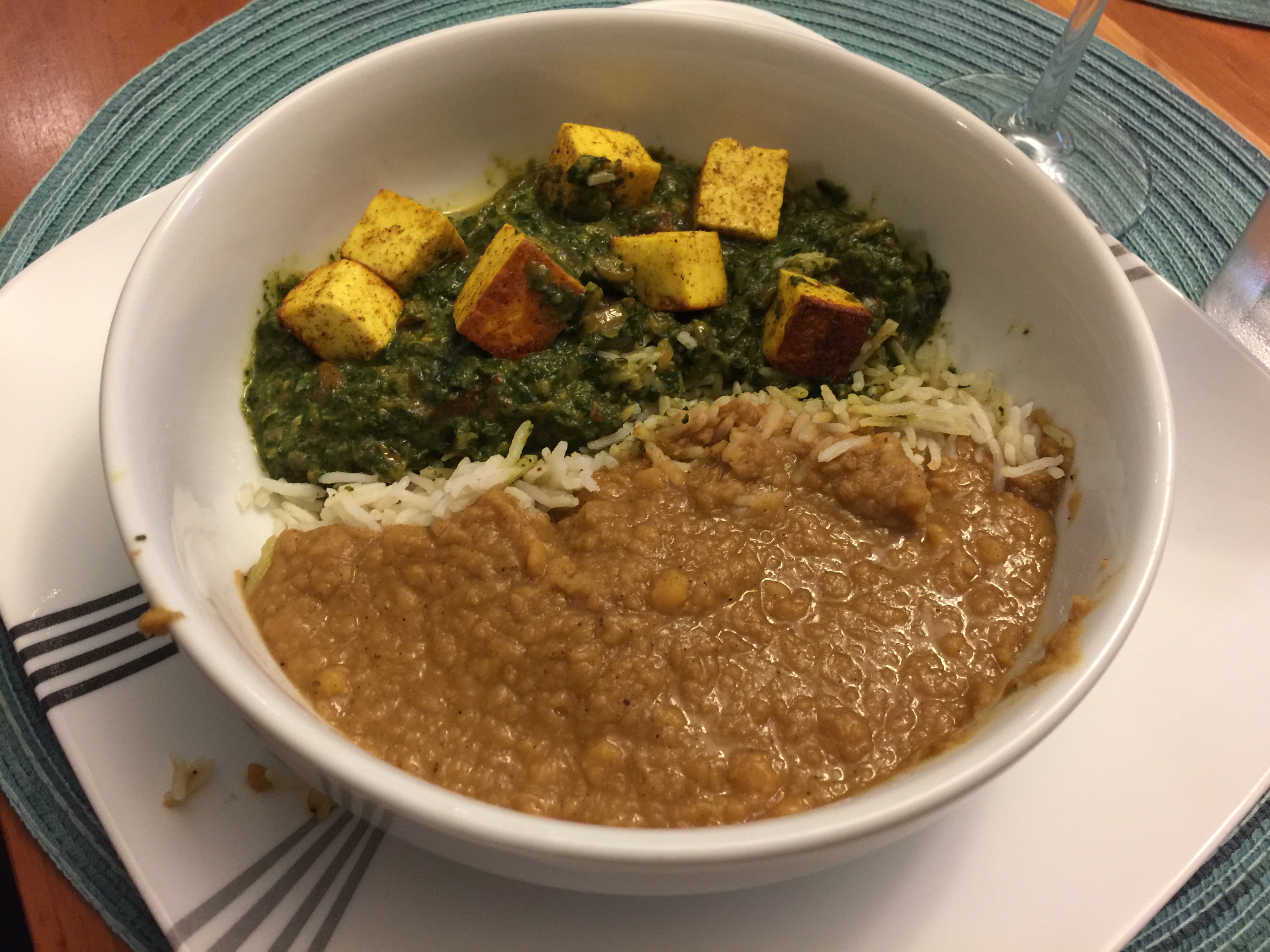 While I was gone John made deviled eggs as an appetizer to take to our son’s house. When we got there I was pleased to see that he had cooked saag paneer. It is not vegan but is at least vegetarian. And it was so good!! I loved the cheese cubes and also the sides of dal (lentils) and basmati rice. It was also wonderful to see my grandkids happily eating what is a pretty healthy dish.