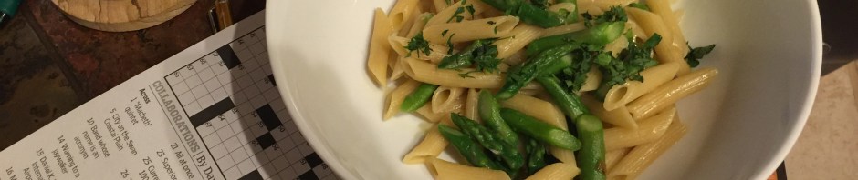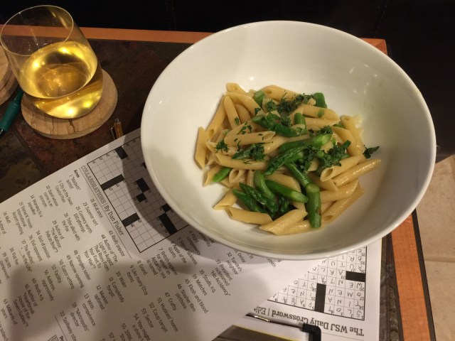 This is a very enjoyable super simple dinner. Sauce for the pasta is pasta water and olive oil.