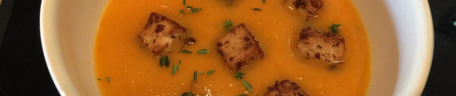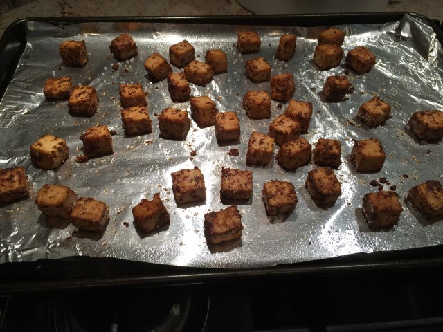 For lunch I was planning on some defrosted Autumn Soup. I decided to make tofu croutons to put on top. I baked some extra firm tofu that I had squished the water out of, seasoned it with soy sauce and olive oil, and then coated it with flaxseed meal. (I use Bob’s Red Mill brand.)