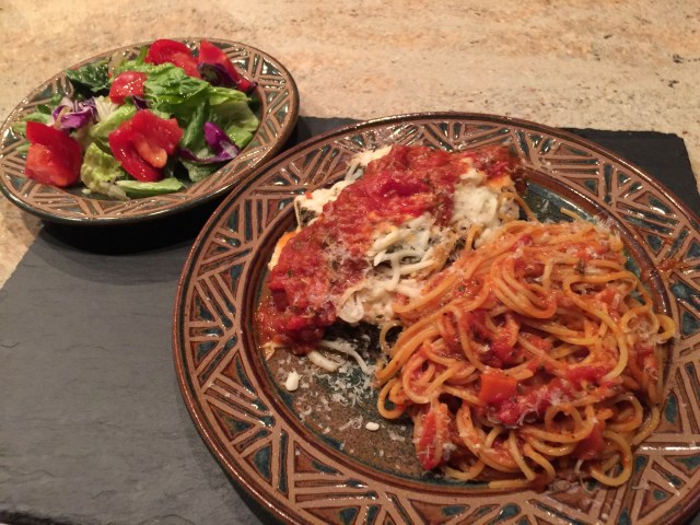 Because I am not doctrinaire about my vegan/vegetarian diet, tonight’s dinner is a mixed green salad, sous vide chicken breast served ala parmigiana, and served with spaghetti.