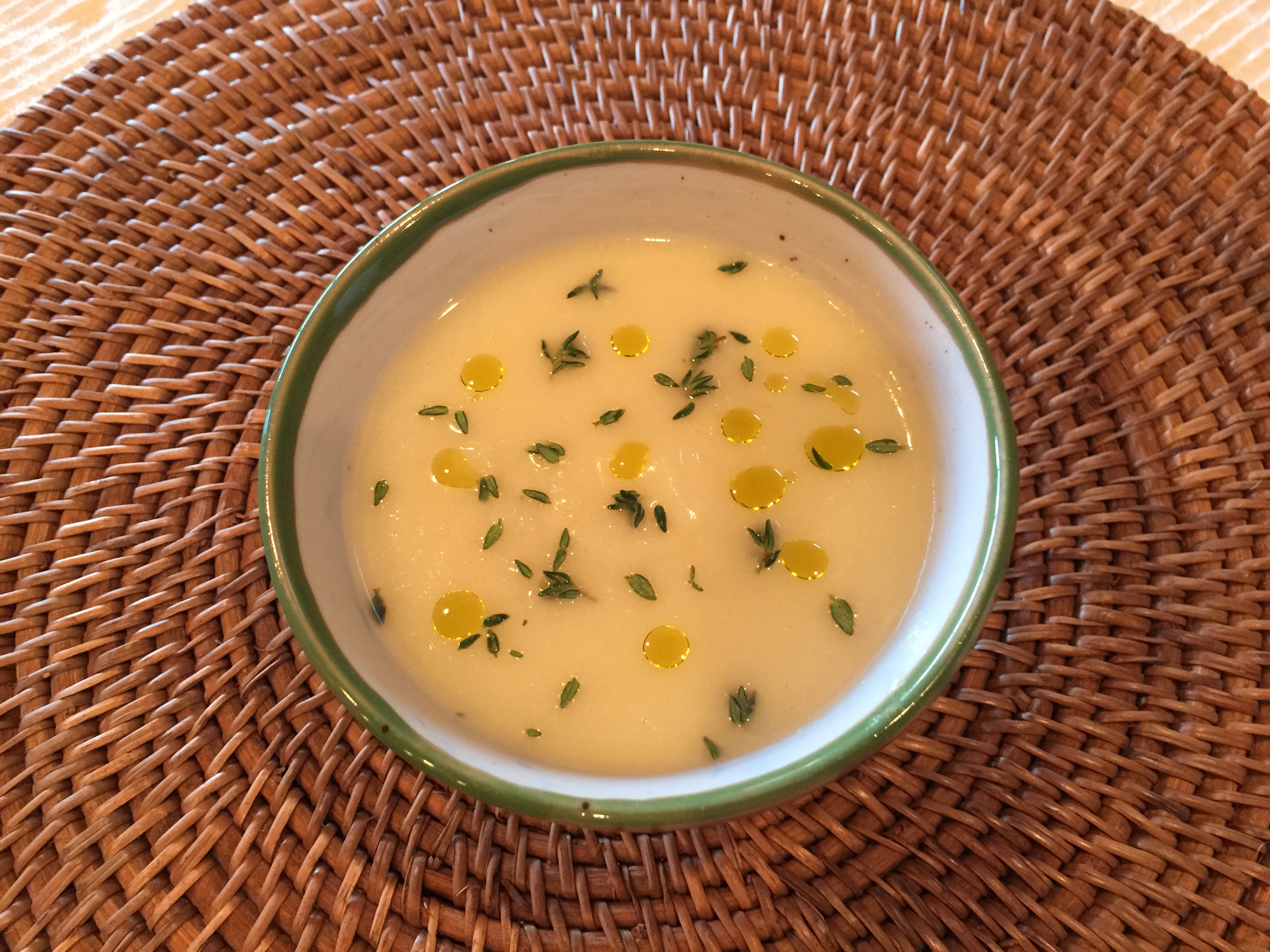 Today for lunch I made a cauliflower soup using the guidelines of the celery soup that I’ve made recently. Sauté in 2 tablespoons of olive oil a chopped medium onion, a head of cauliflower broken apart, and a small chopped waxy potato until the onion is translucent. I also added three sprigs of thyme and of course some salt. Add three cups vegetable stock (I used 2 cups stock and 1 cup water). Simmer until everything is soft. Whiz it up with a stick blender. Serve hot, cold, or room temperature. It has the look and texture of vichyssoise.