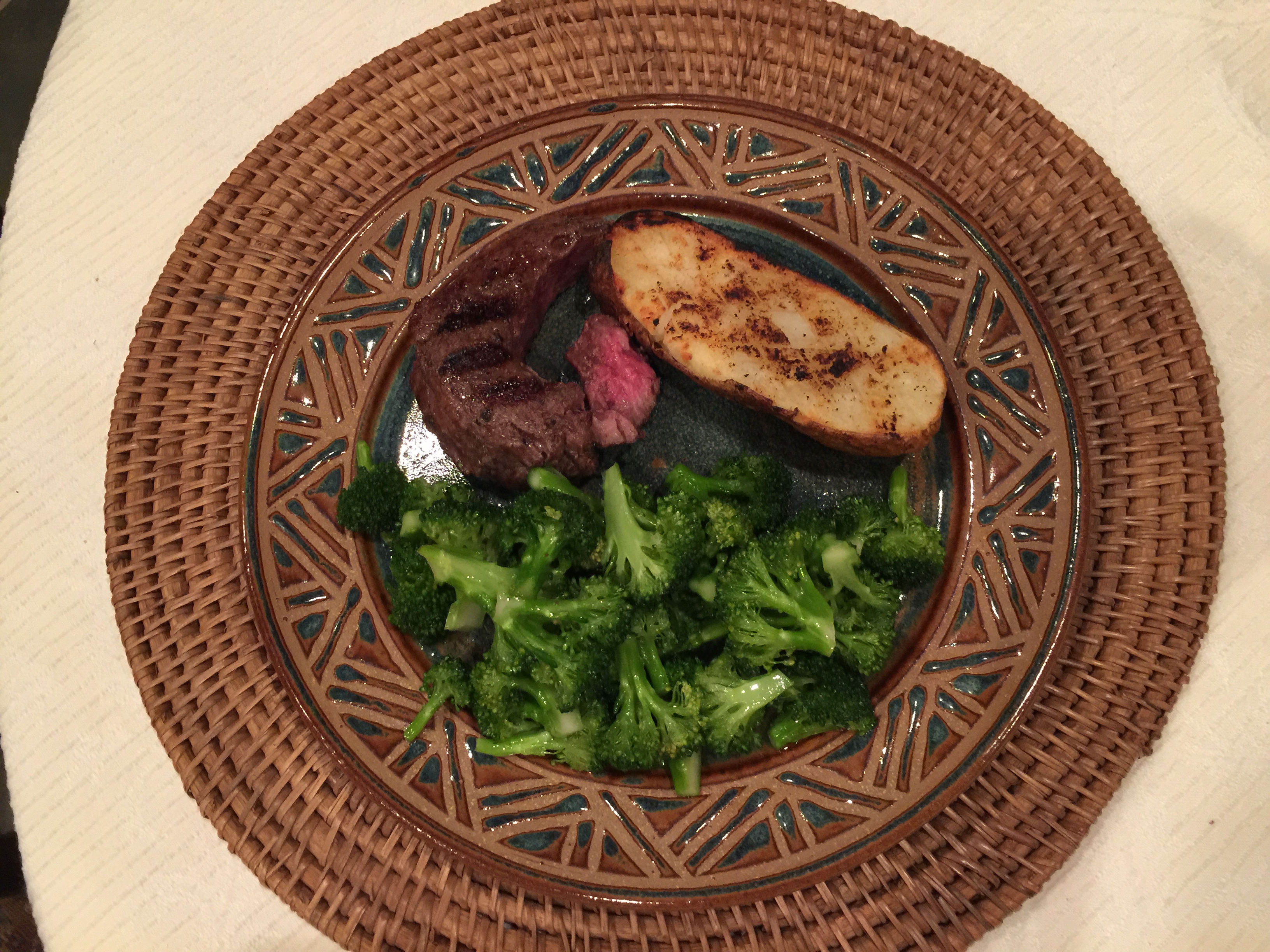 After the vegan daytime portion of my day we settled into a small grilled steak, half a baked potato, and a broccoli salad. I am trying to follow the “portion plate.”