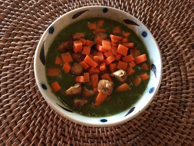 Today I made a very unattractive soup. I think the last time I made it ages ago I used milk instead of stock so it came out light green. With the stock it is dark green. It tastes fine and for the picture I dressed up with some carrot pieces and tofu but it is hard to make a silk purse out of a sow’s ear.