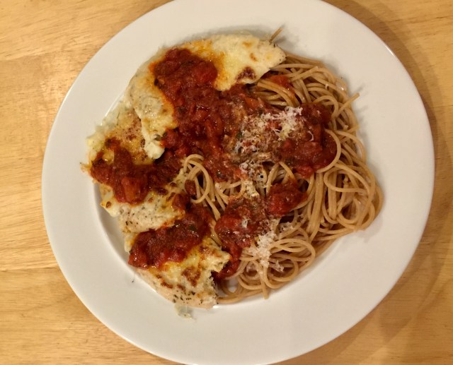 So John is concerned that we still have a whole lot of turkey leftovers and he wants to make a gigantic soup. I am not enthused. I suggest cutting off some cutlet type pieces and making turkey parmesan with spaghetti and salad. I win!