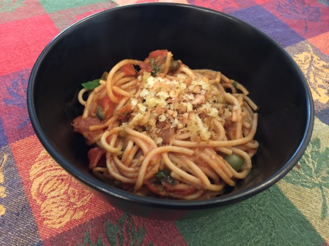 On to why I had pasta twice today. First, I love pasta. It fits into my part-time vegan eating plan and I have been eating the healthy whole grain type. Second, at lunchtime John and I had not discussed the all important “What do you want for dinner” question. So I blithely took out the leftovers of the pasta with olives, capers, and tomatoes that I made on Sunday and ate them for lunch.