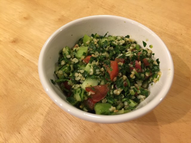 Tonight was a meat night (hamburgers) but I made a really delicious salad on the side, Lebanese Tabbouleh adapted from a recipe by Martha Rose Shulman on the New York Times Cooking site. The salad is more about the parsley and less about the bulgur wheat. Since I erred on the too much salt side, I included a chopped cucumber to balance the flavors out. It seems that no matter how many times I read a recipe I always manage to mess something up!