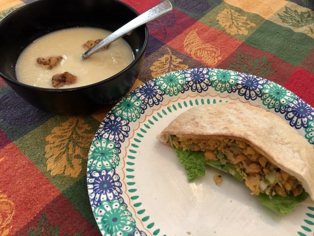 Ho-hum oatmeal glop for breakfast followed by the all-American lunch, soup and sandwich. Probably not too many Americans are eating my soup and sandwich lunch though. I prepared smashed chickpeas with olive oil and lettuce for my pita pocket and had the remainder of the cauliflower soup with tofu croutons.