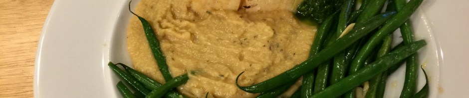 We found a fabulous-looking piece of cod at Safeway and decided upon roasted cod with chickpea purée, parsley sauce, and haricot vert for dinner. John roasted the fish until just done in the oven at 400F and I whizzed up the sauce and the chickpeas with olive oil, garlic, and lemon juice. I gave the beans a quick steam with some sliced garlic and finished with a pat of butter. This was pretty elegant for a Friday night.