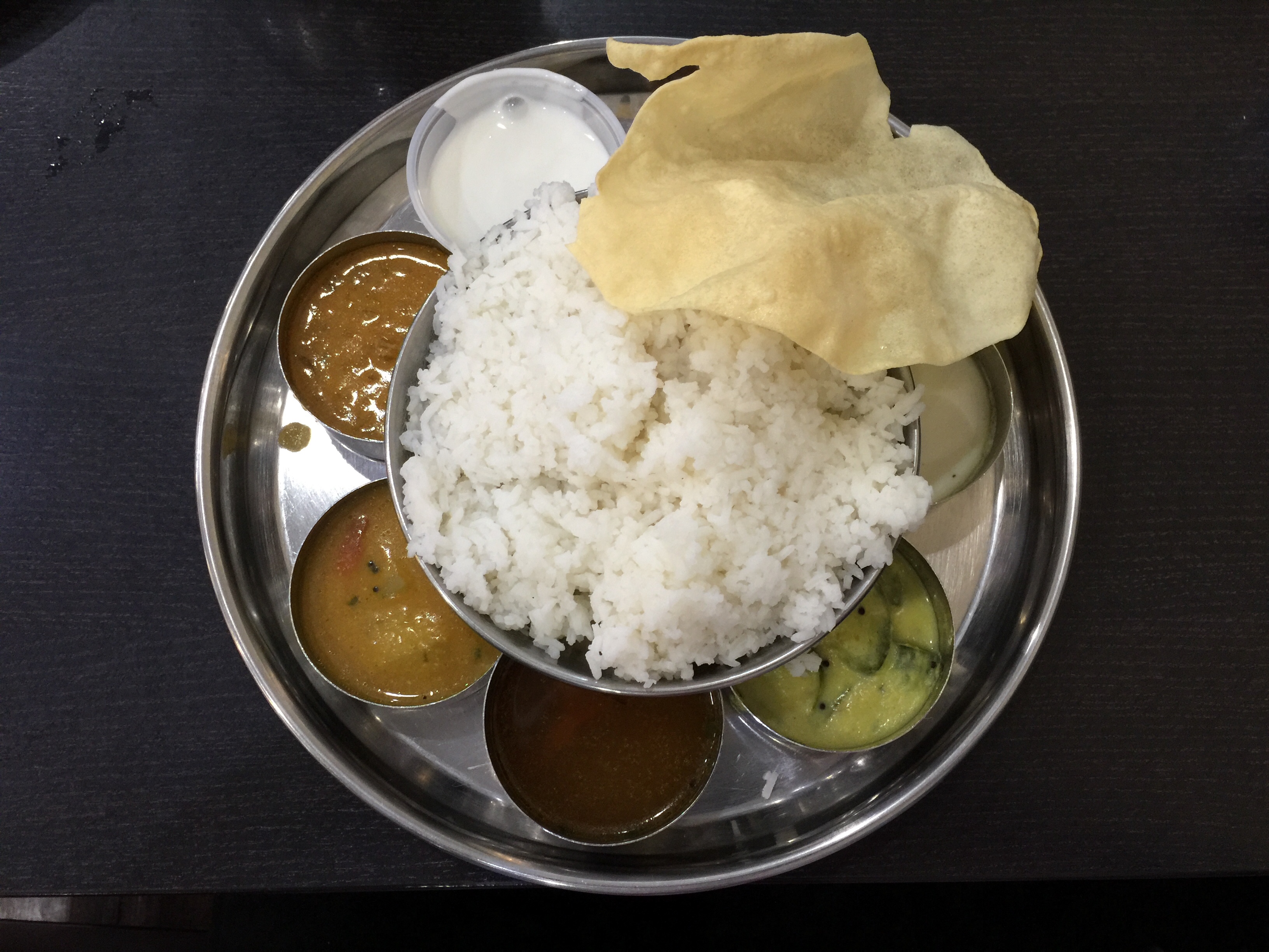 Thali refers to the metal platter that the dish is served on. On the plate are seven or eight cups filled with a variety of condiments running the gamut from spicy, salty, citric, sweet, and mellow. It is served with rice and Indian breads. It was attractive and delicious.