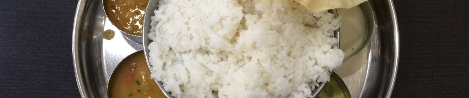 One thing I have found when dining out is that ethnic restaurants often present a much wider set of vegan and vegetarian tastes than standard American fare. Yesterday we had lunch at Ananda Bhavan, a vegetarian South Indian restaurant. I chose their lunch special, thali.