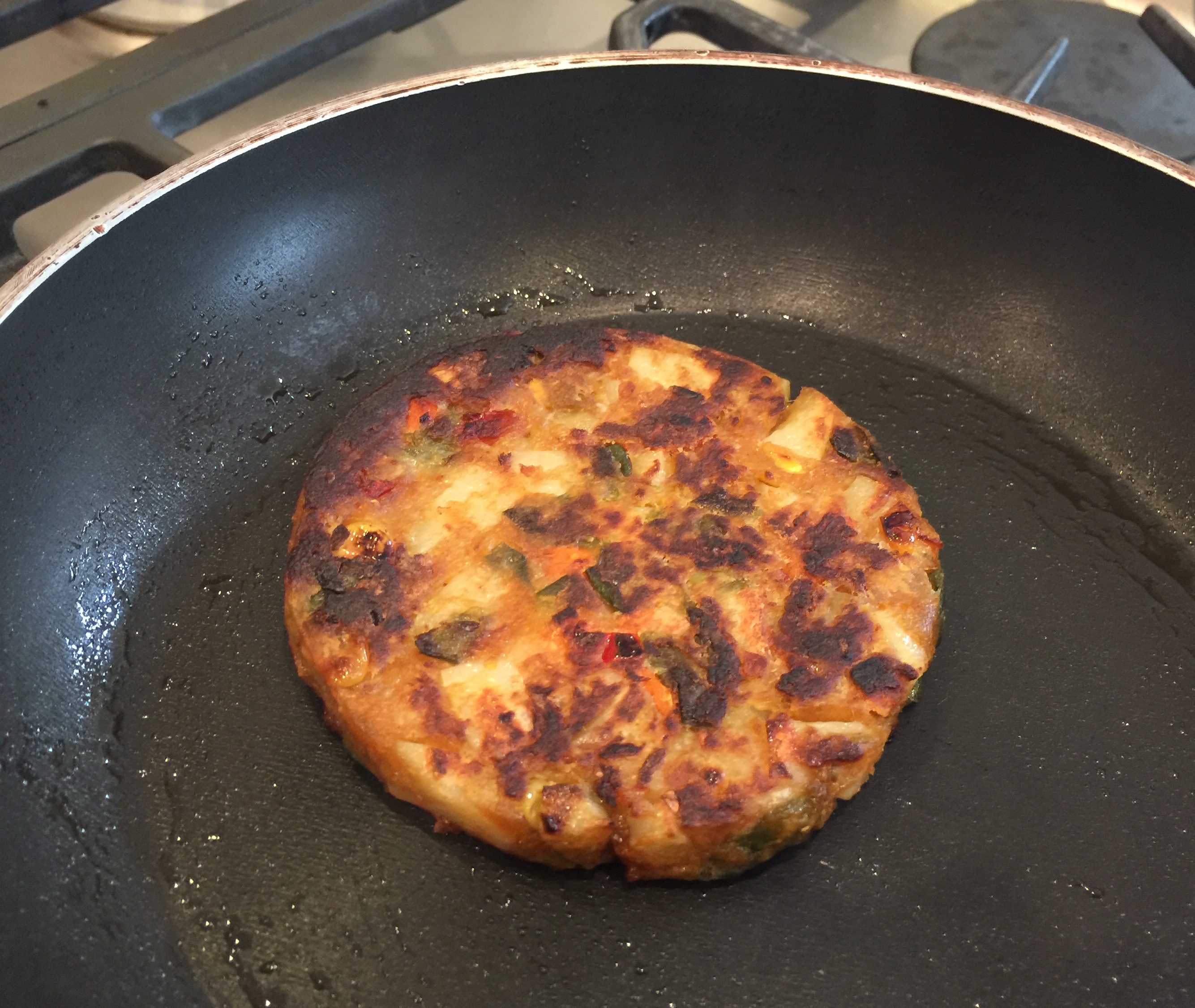 Here it is in the frying pan. The instructions are for either cooking it on the stove top or on the grill. I imagine it falls apart if you cook it in the microwave.