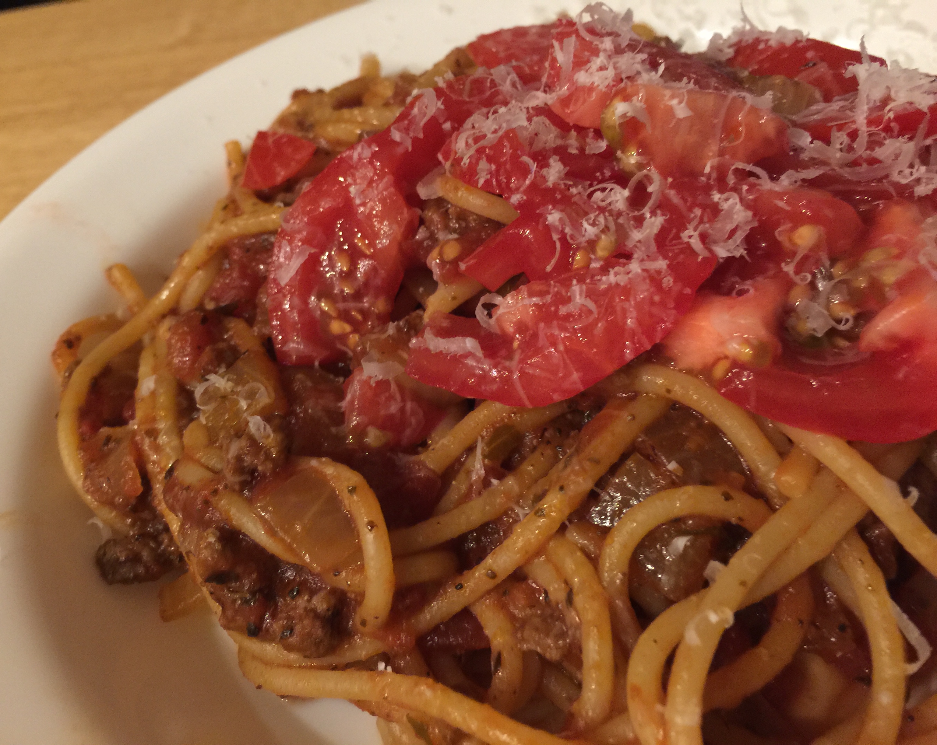 Pasta for supper tonight. Thought we might just have tomato sauce but during a trip to the grocery store, we bought some ground beef. John made the sauce which was very nice of him. I got to lounge around instead of having my back hurt while I bent over the counter chopping up vegetables and stirring the sauce.