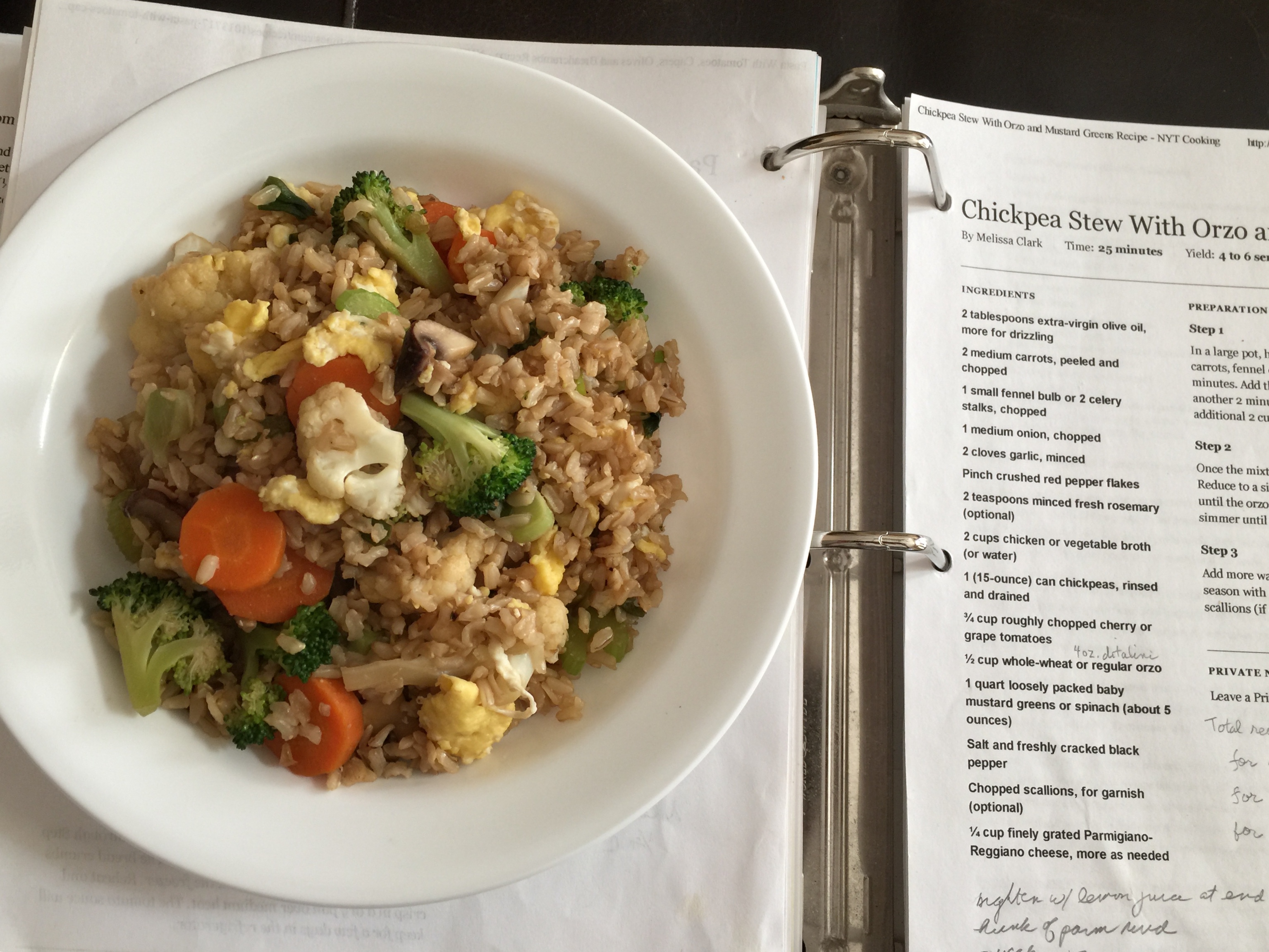 After the Christmas hoopla I made a tasty vegetarian fried rice that turned out pretty well with some egg and leftover brown rice and vegetables that were wilting in the refrigerator. It sits upon my recipe folder. I keep all my recipes that I have tried and as you can see I make notes on the ones I have made so I know what to add or subtract next time I make it. I am making the chickpea soup soon and using my experiences to improve it.