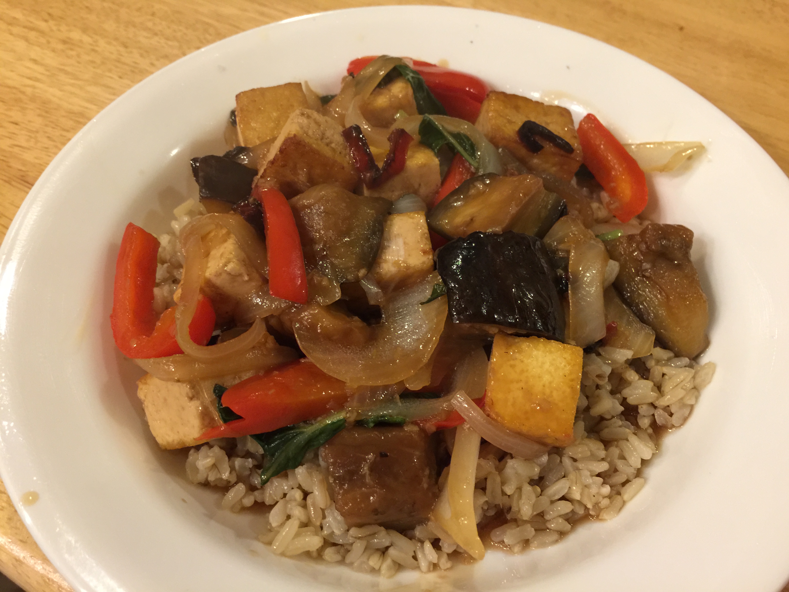 The second dish was our attempt to replicate our favorite Thai dish, Spicy Basil Eggplant with Tofu. It is really pretty easy to make. You stir fry the components and then you add the sauce and it’s done. Our problems with it came from too spicy fresno chiles and using globe eggplant instead of Chinese or Japanese eggplants. We are going to have a redo later in the week and in the meantime I will find the correct types of eggplant.