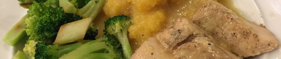 As indicated, Monday was Chicken Monday. This satisfying dinner comes in at about 350 calories. That includes some butter in the rutabagas and on the broccoli and 1/4 cup of the packet chicken gravy.