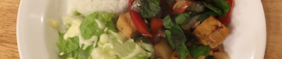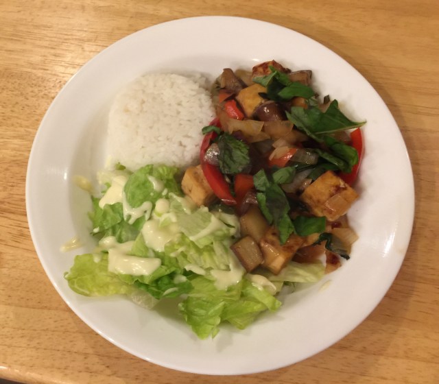 It is basically just a stir fry with a complex tasting Thai sauce. We served this with some rice and a small green salad with a sweet dressing.