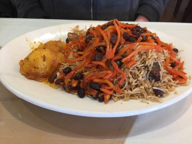 Daughter ordered quablili pallow. The menu said it is Afghanistan’s most famous dish and consists of baked brown Basmati rice with seasoned lamb shank, topped with raisins, almonds and julienne carrots.