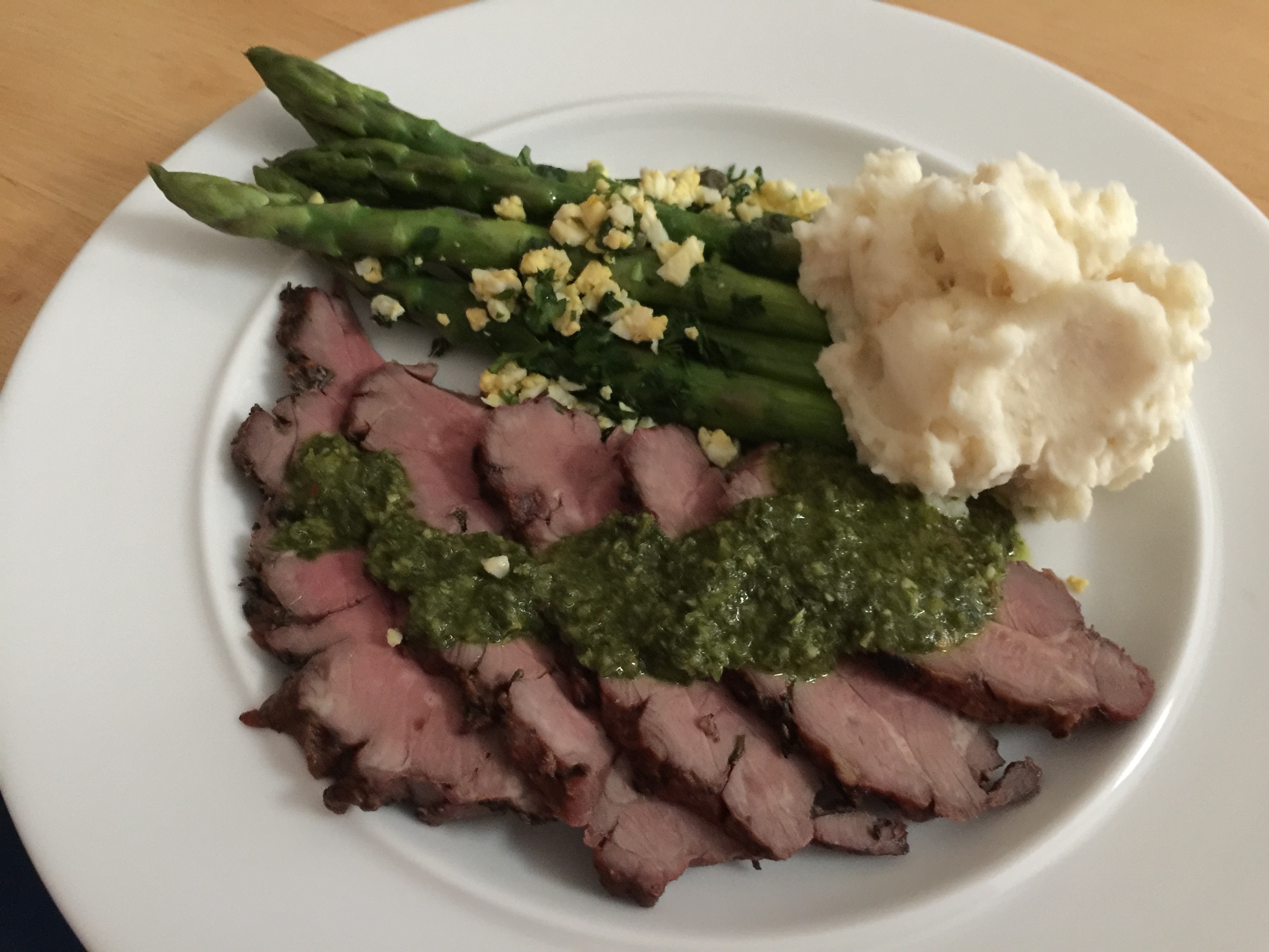 On Sunday we had the family over for a festive dinner. John grilled a boneless lamb leg and I made some fancy mashed potatoes and asparagus. Our daughter made macaroons. On Monday we had the replay.