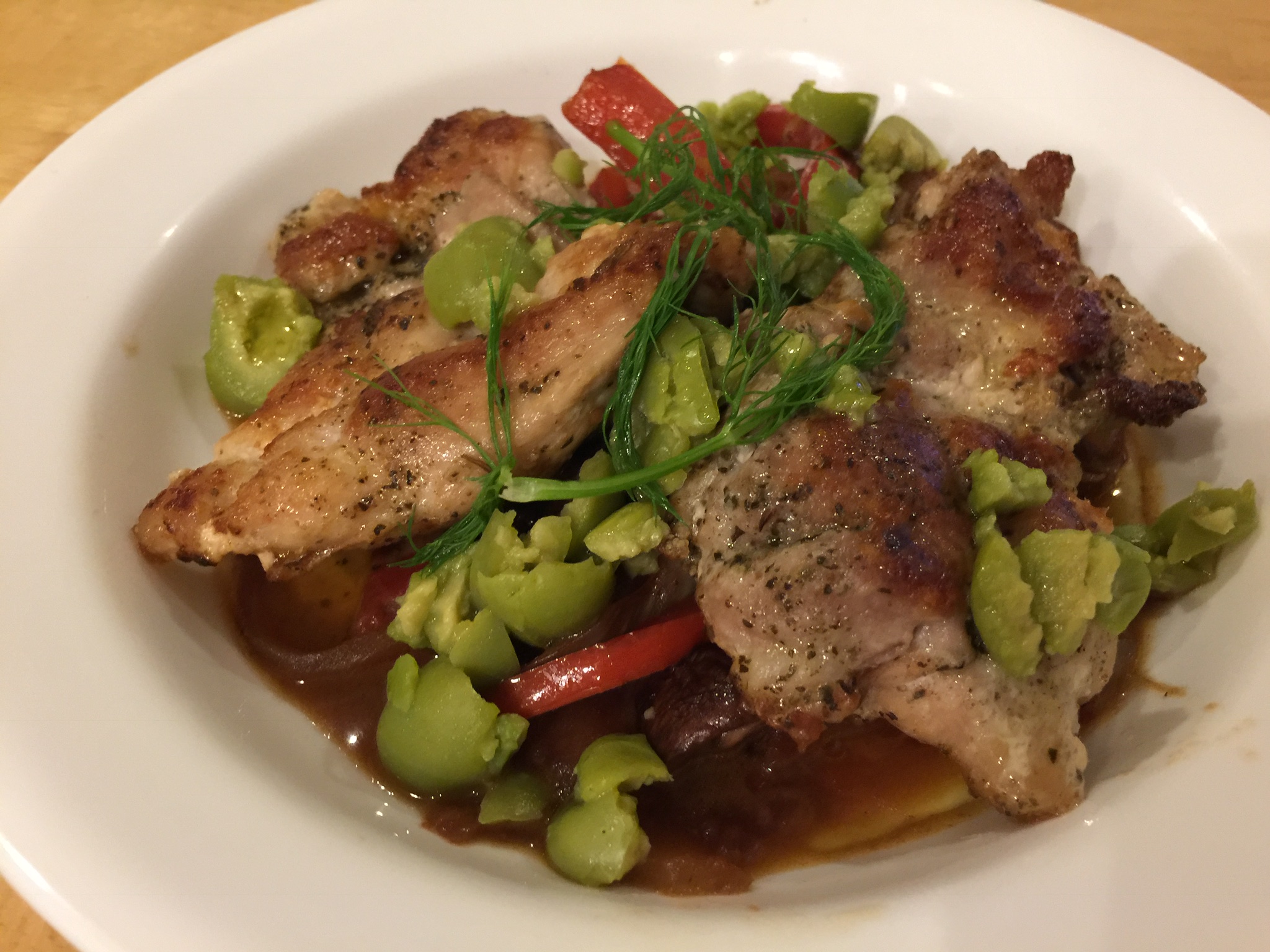 We made this tasty dinner using boneless chicken thighs, fennel, red bell pepper, onion, garlic, olives, red wine, and chicken stock.