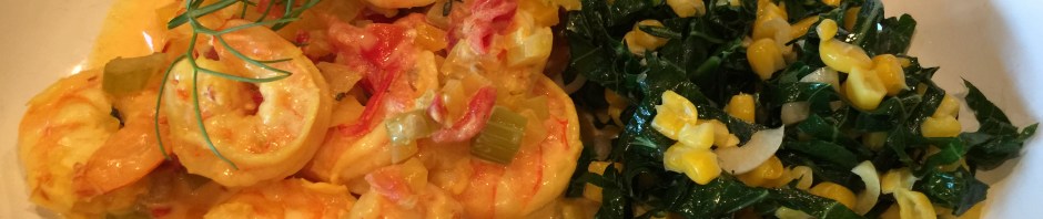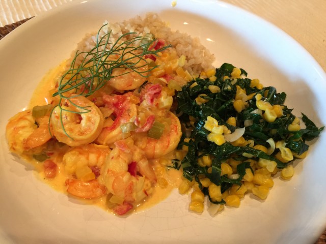 We served this with some brown rice (using the oven method) and collard greens with corn. This dinner takes a lot of fancy chopping up. All the vegetables for the shrimp dish need to be brunoise-ed and the collard greens have to be chiffonaded.