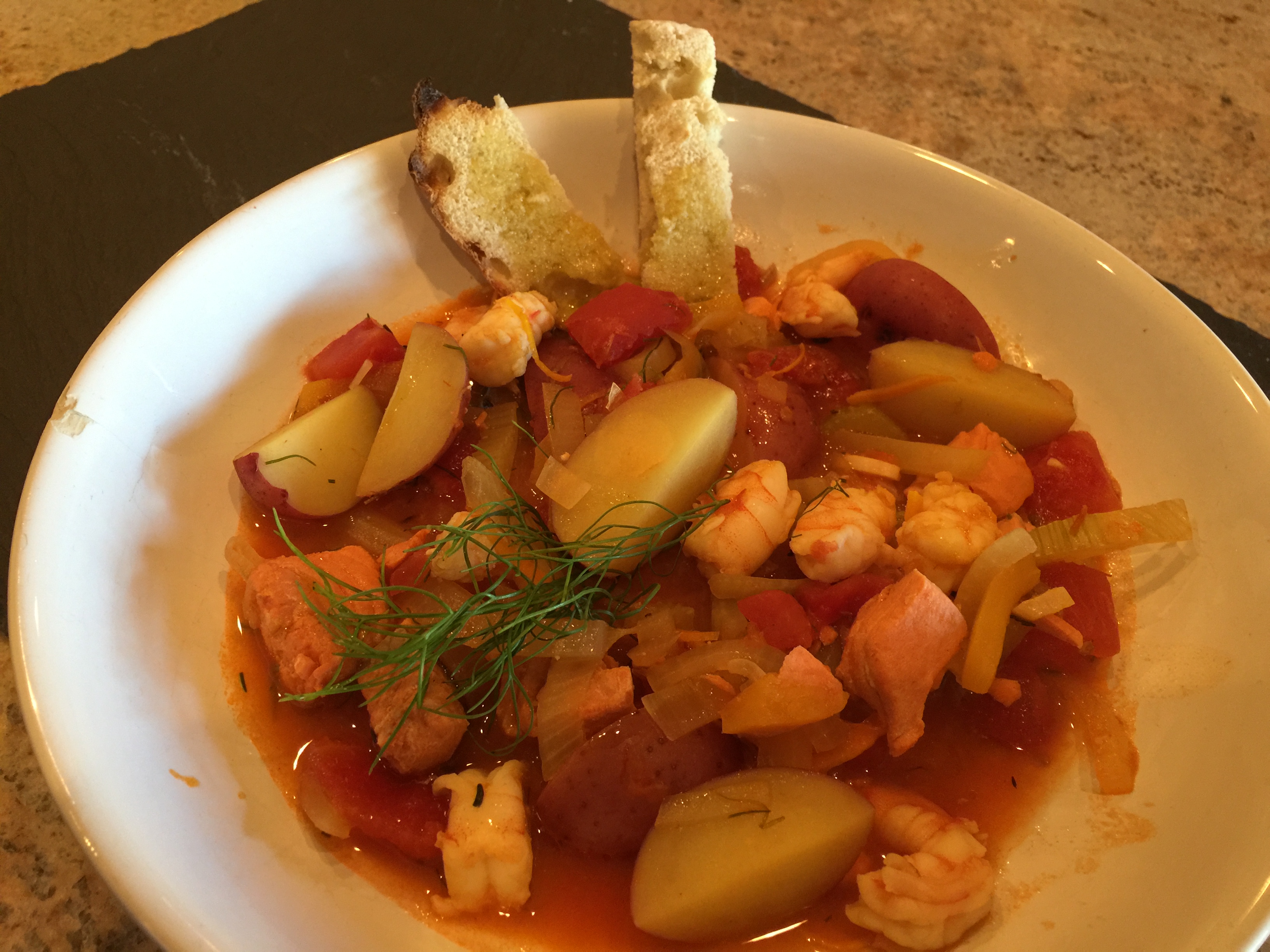 There is not really much to making this. You just chop a bunch of aromatics. Sauté them and then add some fish stock. We used a bottle of clam juice, some stock we made from the shrimp shells, white wine, and canned diced tomatoes with their juice. You also add the potatoes at this point and a bay leaf and some thyme and orange zest. Once the potatoes are ready you add the seafood and a half cup of Pernod. It only takes a couple of minutes for the fish to cook and the soup is done!