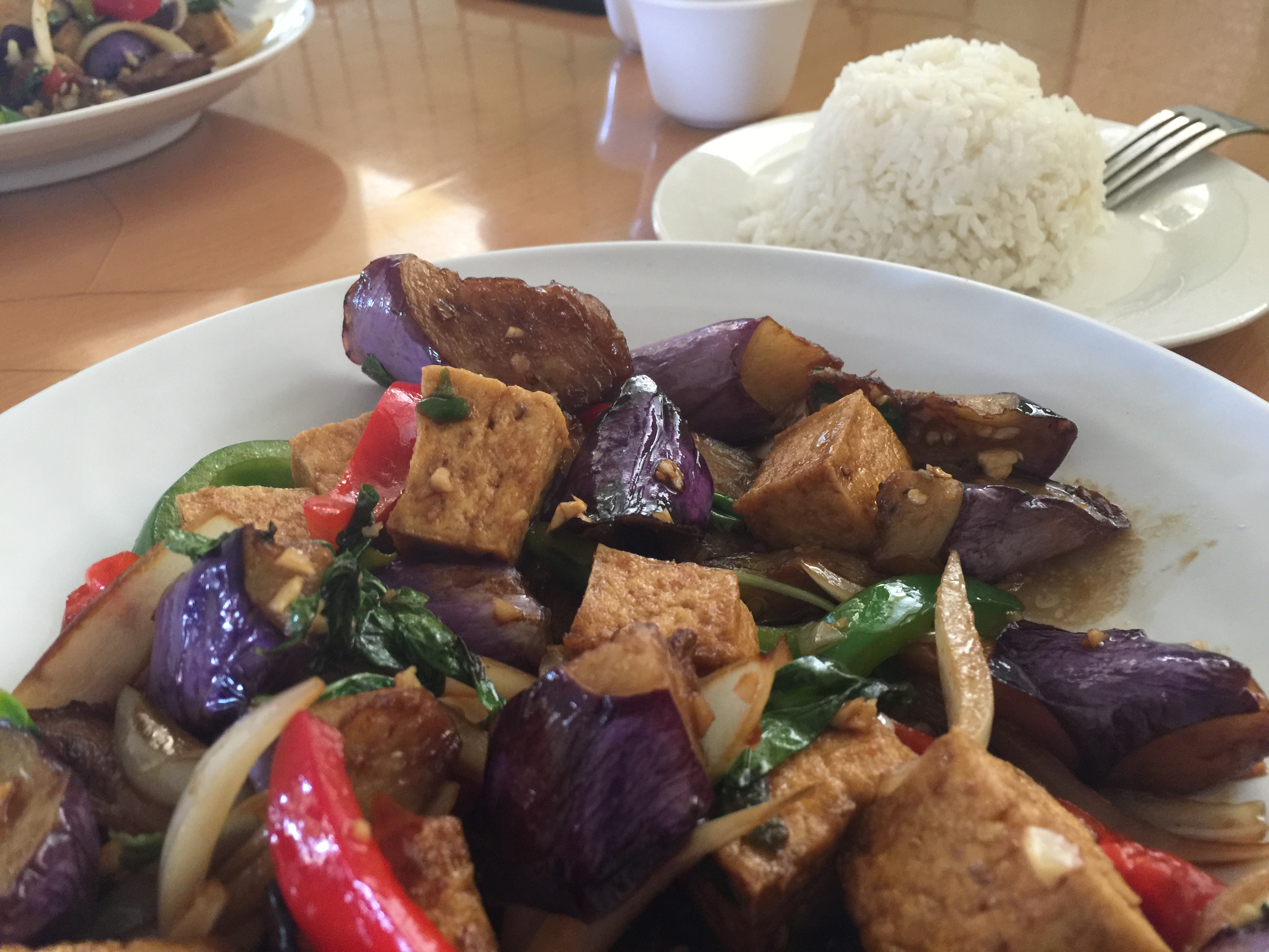 Finding good choices for lunch when you are traveling is always hard. On Sunday during our long trip home we stopped at Mojave Thai Cuisine. It is an unlikely restaurant in a desert town. We had our favorite Thai dish, spicy Thai basil with eggplant and tofu. Since I do not know all the ingredients, I cannot say for sure whether it is vegan or not but it is vegetarian and delicious! We stopped here once before on our travels and we asked for it spicy and it nearly blew our heads off. This time we asked for medium spicy and it was toned down just enough.