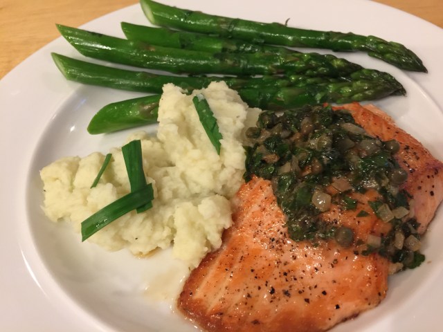 Last night’s dinner was somewhat of a departure from our usual fare. We were going to have classic chicken dinner but when we were at the grocery store we saw this steelhead (which I later learned was not salmon but trout) and since it was fresh fish we wanted to eat it right away. So chicken will have to wait for Tuesday.