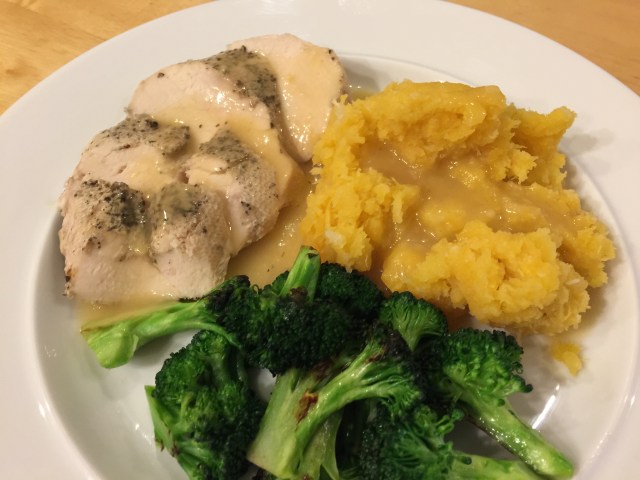 As I said I am going to search for some new recipes to introduce into my rotation. Chicken is way overdue for a makeover. But for all times sake, we have one more chicken classic, that is, chicken breast sous vide, pressure cooked rutabagas, and broccoli. I put a little sear on the broccoli and we also made some chicken gravy.