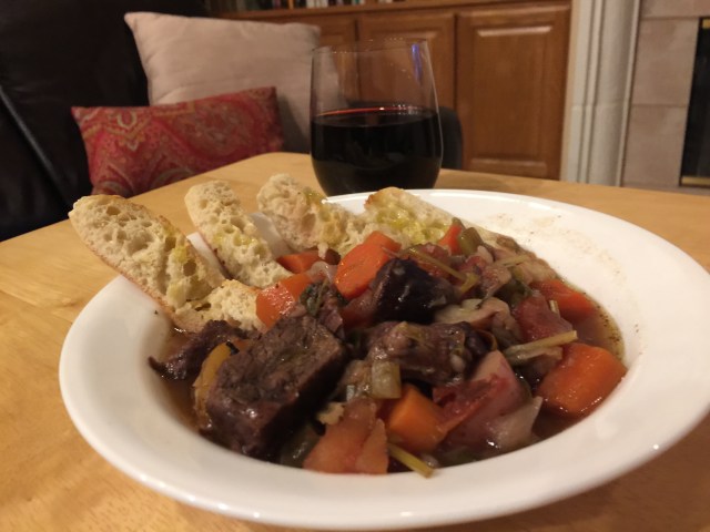 This beef stew was good but not as good as the first one we made. I think it was because we added too much liquid forgetting the fact that the vegetables give off a bunch of liquid as they cook. We are going to have it as leftovers dinner tomorrow night and I think I will put more vegetables in and beef up the sauce that they are swimming in.