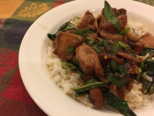 I got this recipe from the recent Cook’s Illustrated magazine. It was their take on 3 Cup Chicken which I did not know was a thing. Apparently the original has a cup each of soy sauce, Chinese wine, and sesame oil. That would be awfully intense with all that sesame oil. The new recipe has 1/3 cup of the soy sauce and wine (I used dry sherry) and a tablespoon of sesame oil.