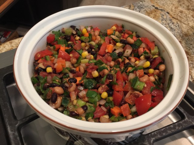 I also made some Texas caviar which is basically a whole bunch of chopped up vegetables and black beans and black eyed peas with a light spicy dressing. I added a touch of chipotle powder to give it a smoky taste.