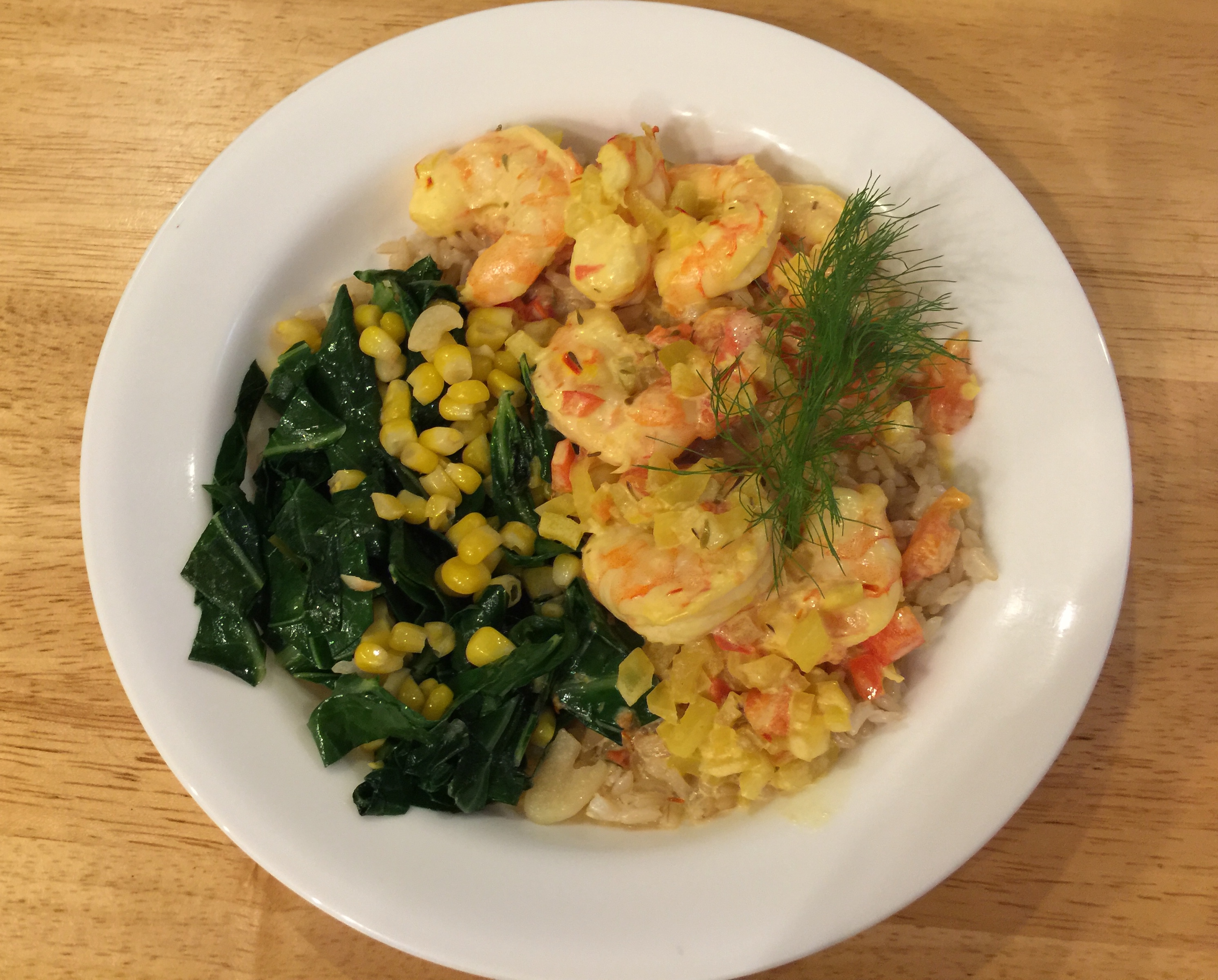 It takes quite a bit of chopping since you have to make a brunoise of fennel, onions, bell pepper, and onion. There is also a cup of chopped tomato and a chiffonade of collard greens. I took care of all that before John got home from work so his job was just to do the cooking. I also made the brown rice ahead in the Instant Pot but have decided it has a better flavor when I make it in the oven.
