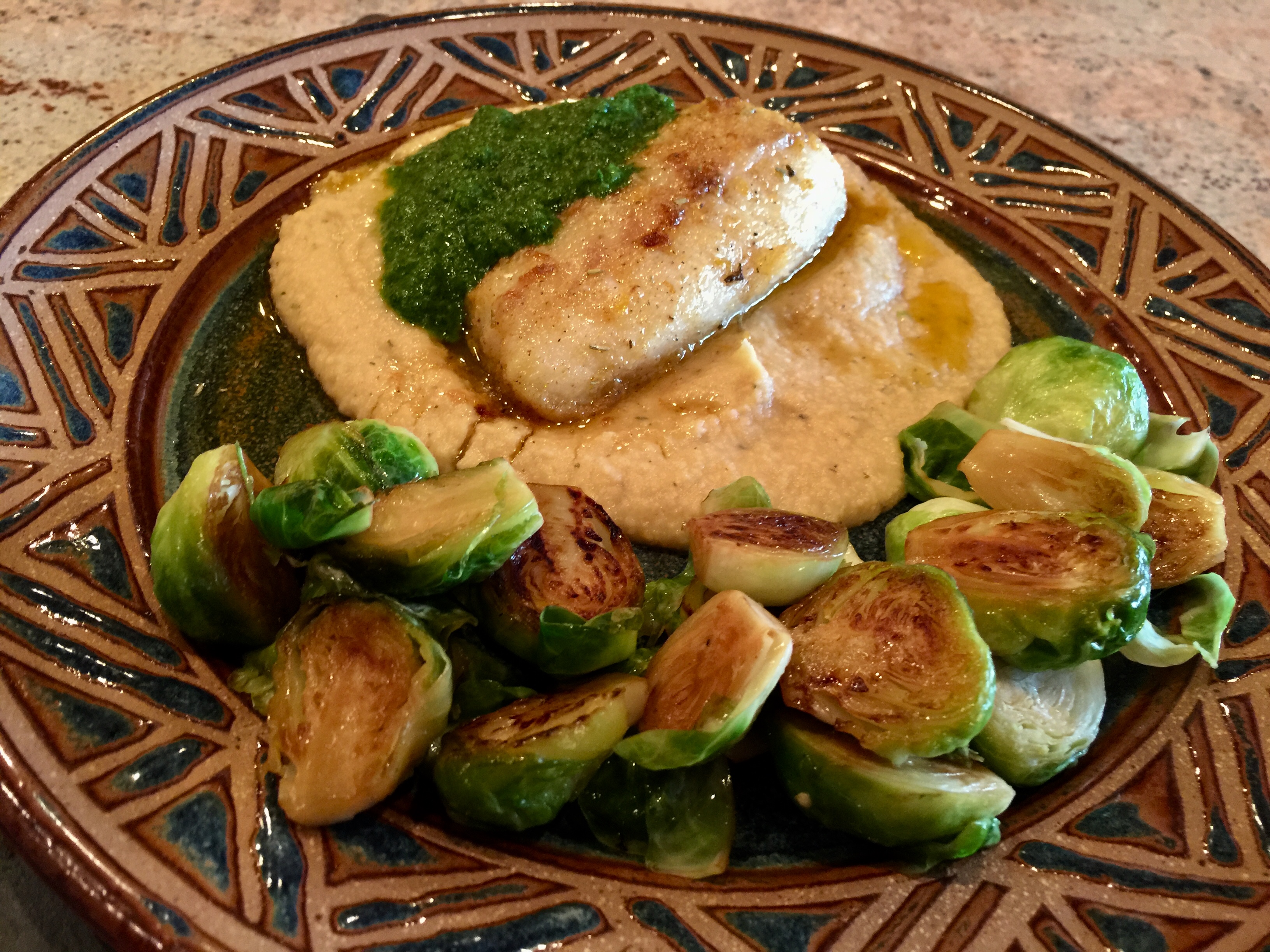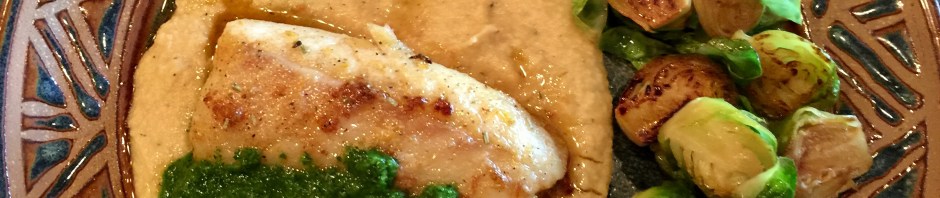 This dinner has a lot of moving parts. There is a parsley sauce, a chickpea purée, the cod itself, and we added a vegetable, Brussels sprouts. The recipe suggests that you make the parsley sauce in the blender and chickpea purée in the food processor. That is too many gadgets to wash! I made them both in the food processor. John roasted the cod in the oven after marinating it. You can find the recipe for this dish on the Food and Wine website. Actually the only thing that did not turn out as well as we would have wished was the cod. We had thawed individually frozen cod portions but the fish had lost its internal structure and ended up spongy. Make this with fresh fish if possible.