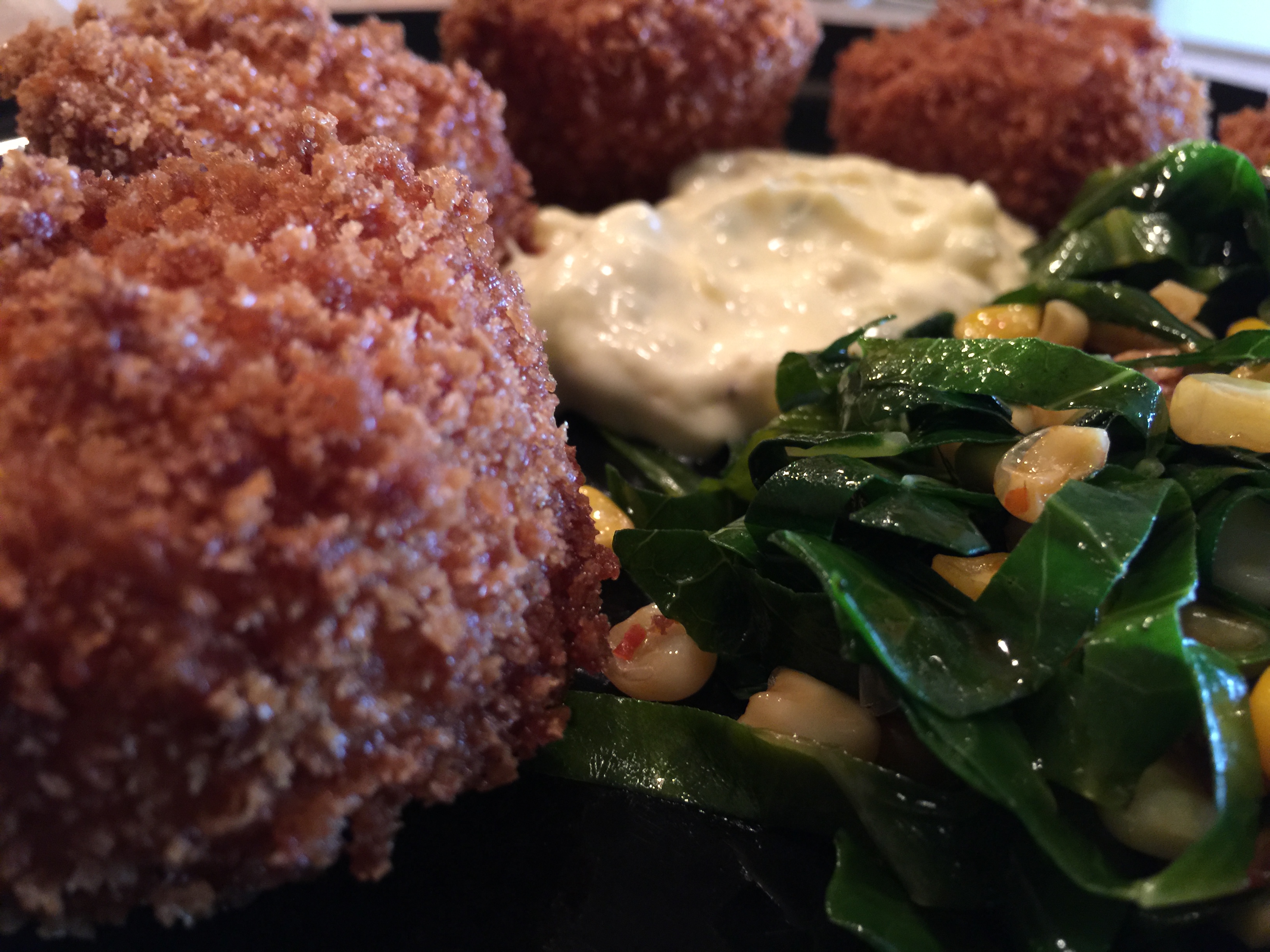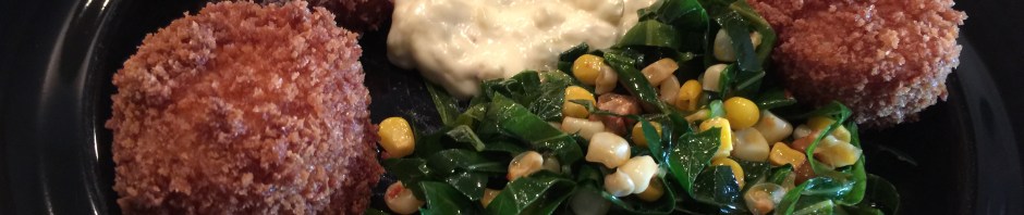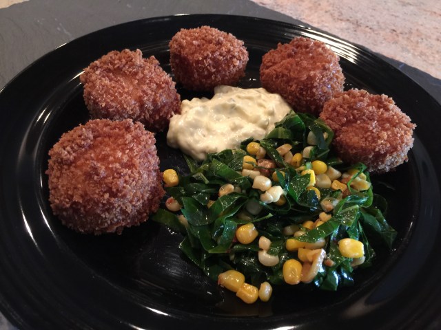 The collard greens were quite bitter, more than usual. Having the sweet corn with them helped but I read that in addition to adding a sweet element, using a fatty element like bacon or sausage, blanching them first, adding acid like lemon juice, or plenty of salt will help. I will keep that in mind the next time I make them. And as usual I made the Fish Market tartar sauce which is a combination of mayonnaise, sweet relish, yellow mustard, lemon, and grated onion. The yellow mustard is the key to its savory goodness.