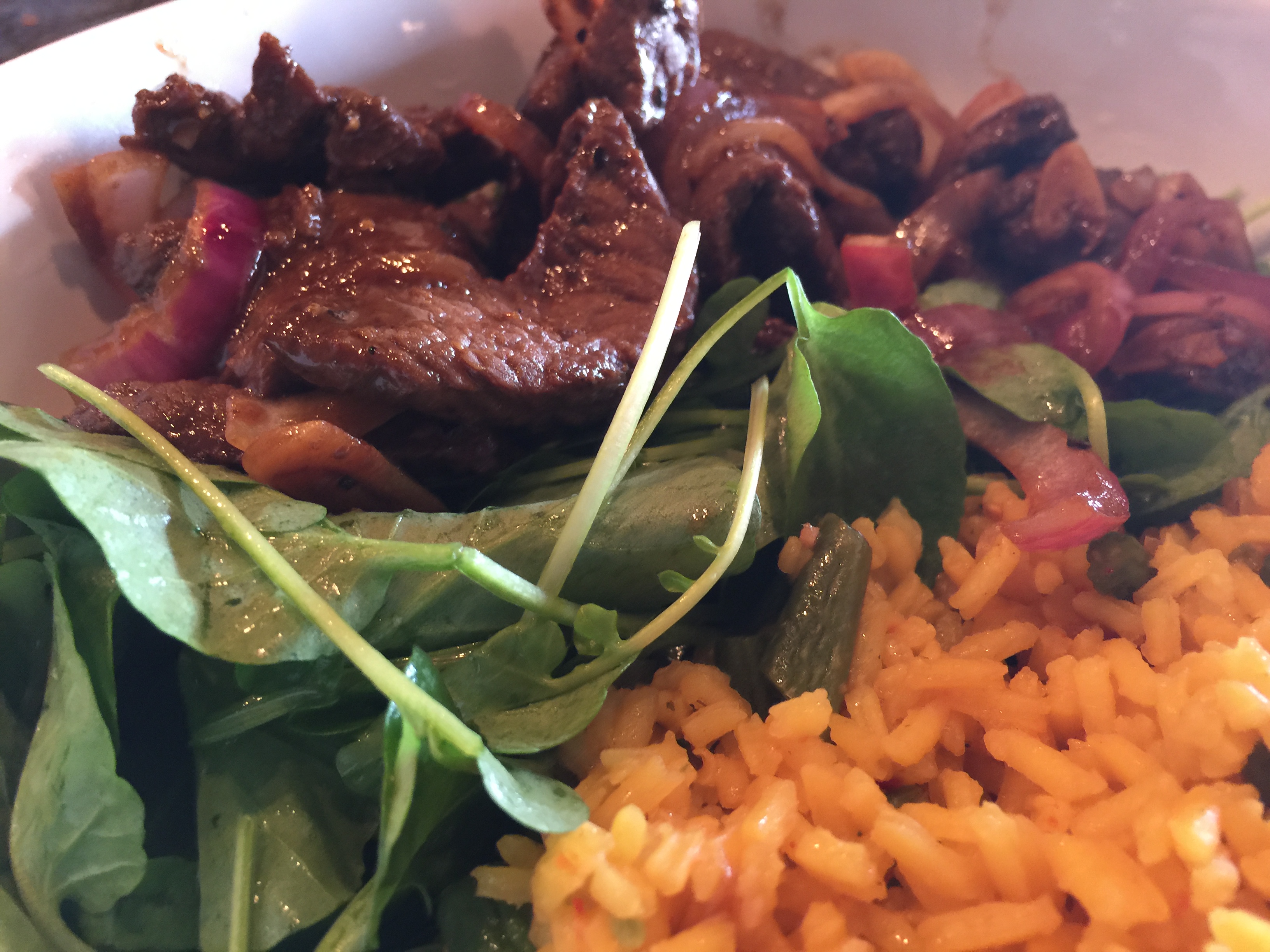 I have not eaten a lot of watercress. Although the watercress was super bitter by itself it was the perfect foil for the beef and onions with its salty sauce. The rice was left over from our salmon meal. I added some soy and fish sauce to it to make it fit with the flavor profile of the dish.