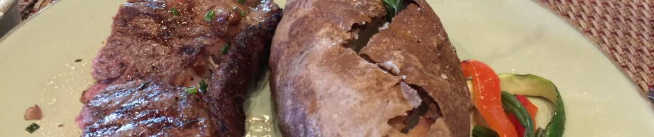 I ordered steak following Utah rules. In other words don’t order anything in a Utah restaurant with an elaborate preparation. Kill cow, cook cow, eat cow is our mantra. Along with the dead cow I also got a dead baked potato cooked some time in the last decade and a few limp “seasonal” vegetables.
