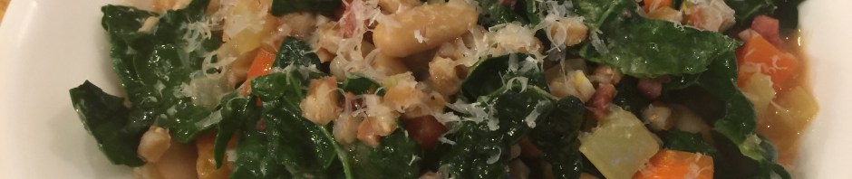 Put 1 T olive oil in a large pan or pot over medium heat. Cook pancetta (if using) until not raw and then add onion, carrots, celery, and salt and pepper to taste. Cook until vegetables begin to soften and onion is translucent. Add garlic and cook another minute or two until fragrant. Add farro, cannellini, tomatoes, and stock. Let simmer 25 minutes until flavors are well blended. Add more stock if needed to get the consistency you would like. Add the kale submerging it in the stew. Cook another 5 minutes or until the kale is wilted.