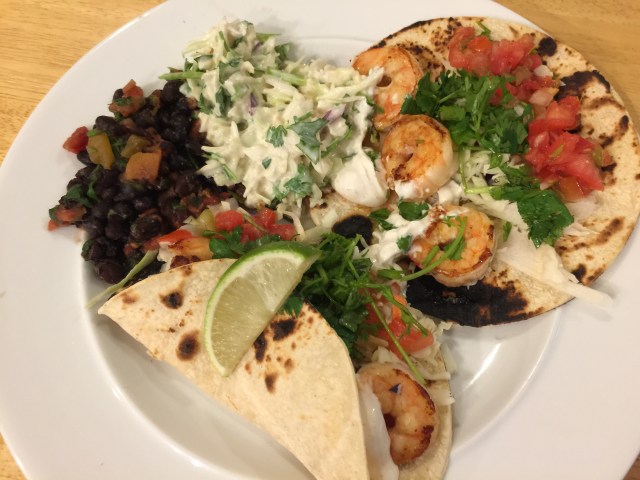 What a good dinner tonight! Even though we did not use the grill to cook the shrimp and tortillas tonight because it was blazing hot out, everything was super good. We really enjoyed my concoction, Mexican slaw. I added the juice from a can of Rotel to some sour cream and a little bit of mayo along with cumin and chipotle powder. I had bought a pack of shredded cabbage to serve along with the other taco condiments so I had plenty left over for the slaw. Great, easy dinner!