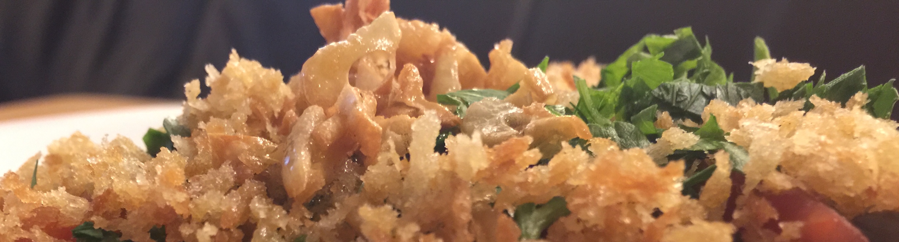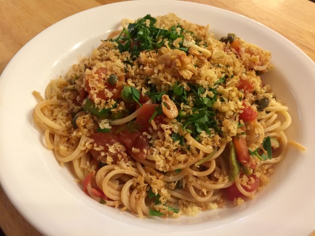 This is a super easy and delicious vegan pantry dish. The sauce is made up of a can of tomatoes, some capers and olives and garlic and onions. The topping consists of some toasted garlic and breadcrumbs with parsley. From start to finish with me cooking the sauce and topping and John cutting up the garlic, boiling the water and cooking the pasta, the dish took us around 35 minutes. We used a combination of regular and whole wheat pastas. This dish is definitely a keeper!