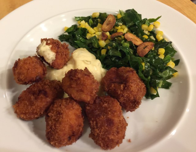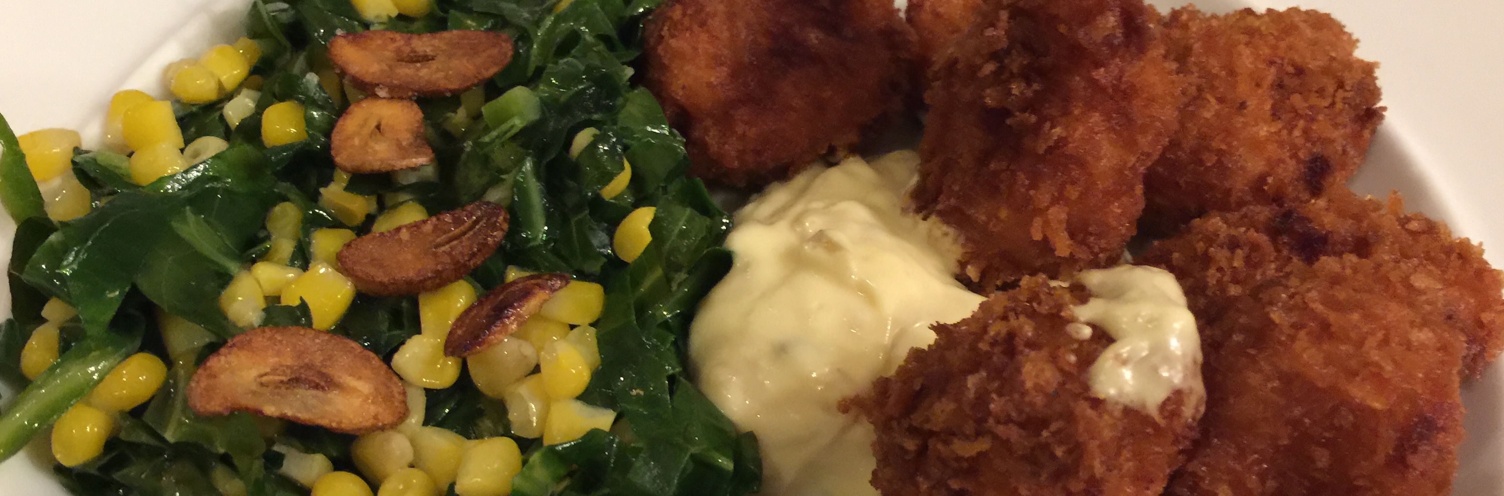 It is my favorite again! The scallops were a little smaller so we had more of them. The collard greens are chiffonaded and sauteed quickly. I toasted up the garlic pieces separately so they would not get burnt.
