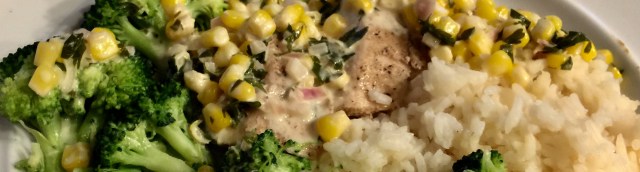 Pierre Franey did not sous vide his chicken breasts but we are trying to keep the heat down in the kitchen and we know that using the immersion circulator will give us perfectly cooked chicken. John makes the sauce of shallots, corn, and cream while I get the broccoli ready and heat up the leftover rice from our Chinese take-out dinner on Sunday.