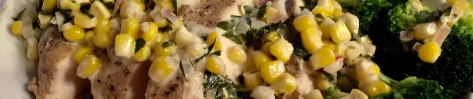 Pierre Franey did not sous vide his chicken breasts but we are trying to keep the heat down in the kitchen and we know that using the immersion circulator will give us perfectly cooked chicken. John makes the sauce of shallots, corn, and cream while I get the broccoli ready and heat up the leftover rice from our Chinese take-out dinner on Sunday.