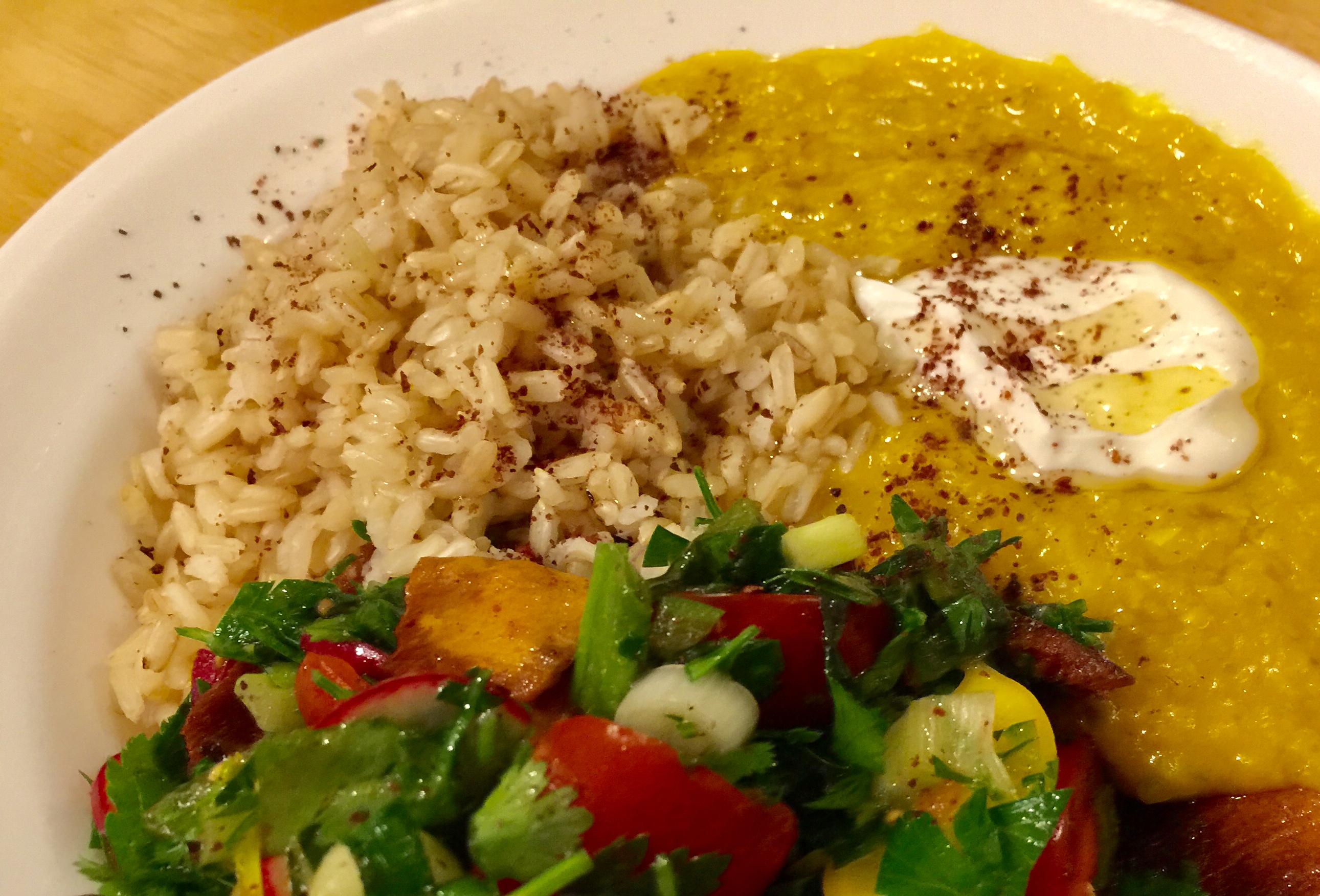 We had this lentil dish a few weeks ago and it was really delicious. Having made it once we knew how to tweak it more to our taste. We used a little less ginger in it. I made the brown rice first thing in the morning in the oven so it would not heat up the kitchen later in the day. Fattoush is like a Lebanese panzanella salad. It has lettuce, parsley, mint, tomatoes, cucumbers, green onions, and crisped up pita broken into pieces and then sauteed in a bit of olive oil and dusted with salt, pepper, and sumac. Sumac is a citric-tasting spice. The dressing is olive oil, lime juice, sumac, salt, and a pinch of allspice and cinnamon