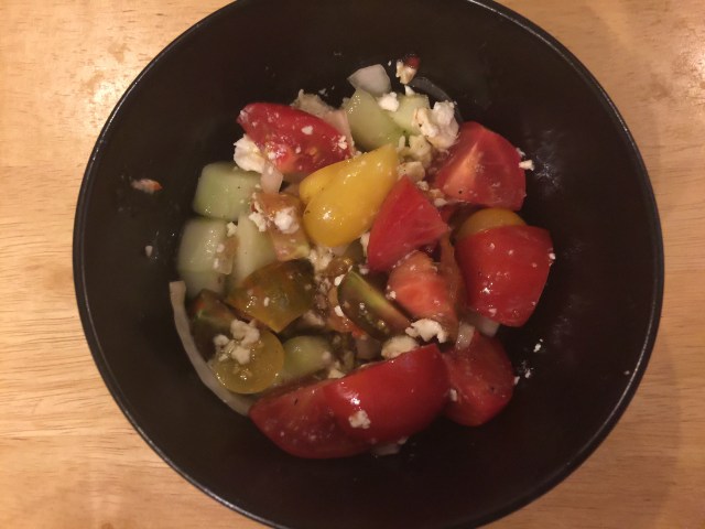 For tonight’s dinner we decide to do a first and second course. Our first course is cucumber and tomato salad with onion and an Italian dressing. We added some feta which you would omit if you want a totally vegan rather than a vegetarian dinner.