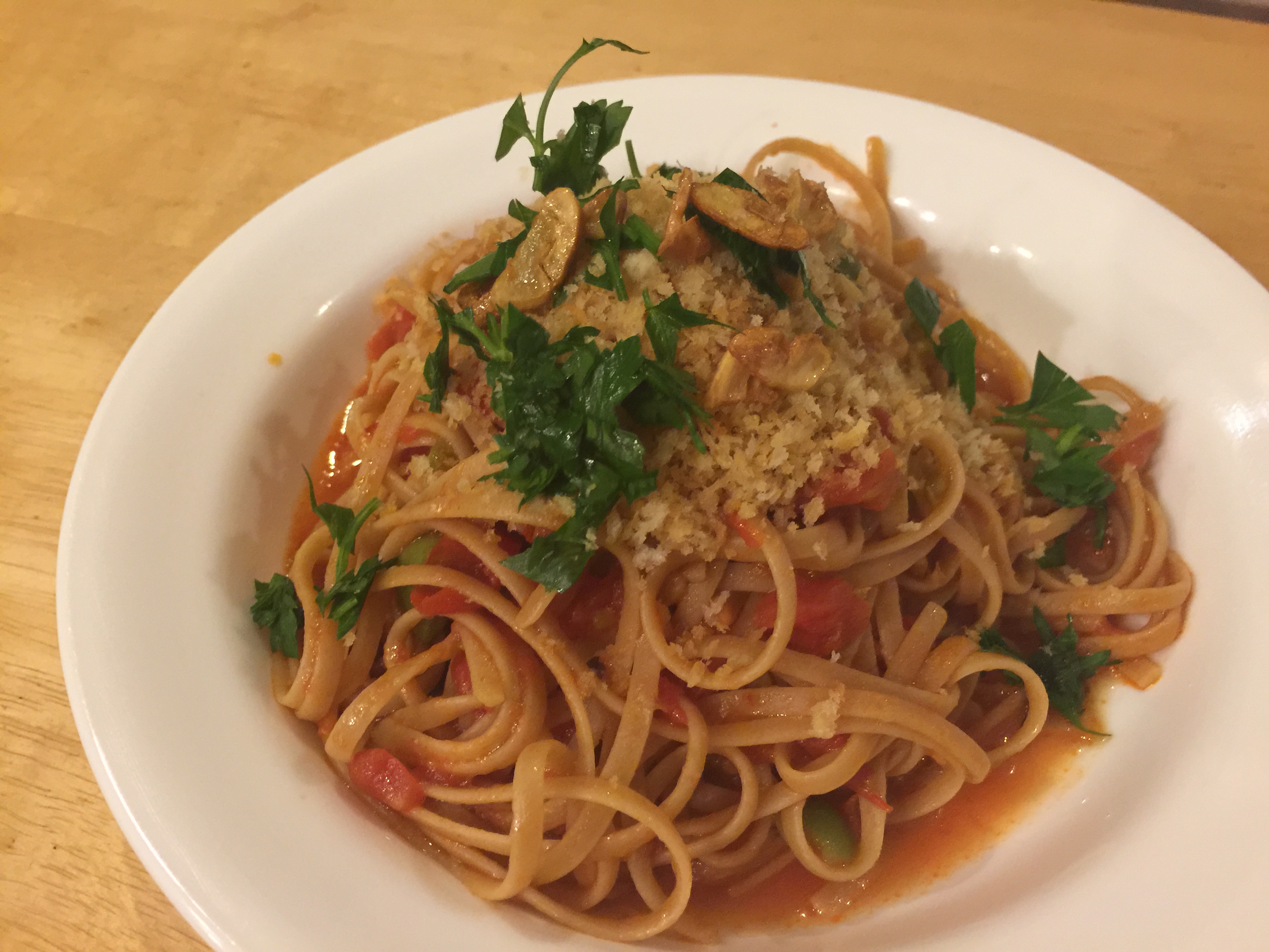 For our main course we have prepared whole wheat linguine with a tomato, olive, and caper sauce. As garnish instead of cheese there are garlic toasted breadcrumbs, toasted garlic chips, and parsley. This is a really delicious dish based on a recipe from the NY Times Cooking site. We have put it into our dinner rotation in the vegetarian category.