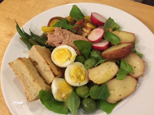 It has been really hot for over a week now. I am attempting to find different dishes to make for dinner that will not heat up the kitchen. Today’s attempt, Salade Niçoise. This is more of an assemblage of various components rather than an integrated dish. I have no idea why it is famous.